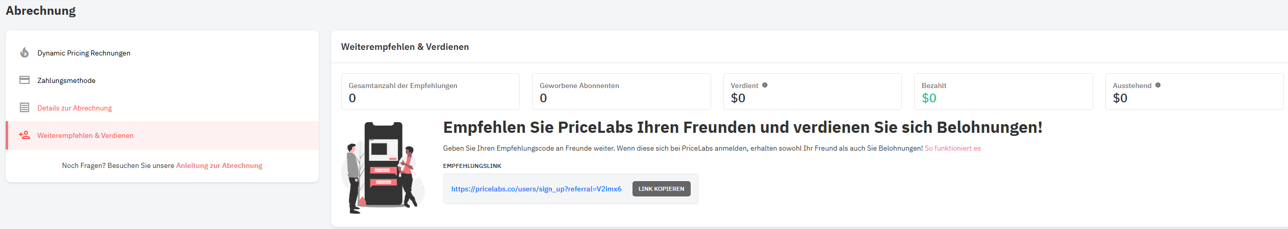 • Das Empfehlungsguthaben kann nur für neue Konten verwendet werden. Wenn jemand bereits ein Konto bei PriceLabs hat, kann er Ihren Link leider nicht einlösen.