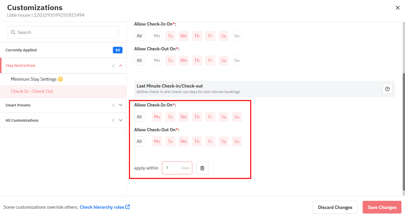 You can create a separate set of restrictions specifically for last-minute bookings under Last Minute Check-in/Check-out from the same page. This allows you to set a different Check-in/Check-out rules for days that are getting closer.