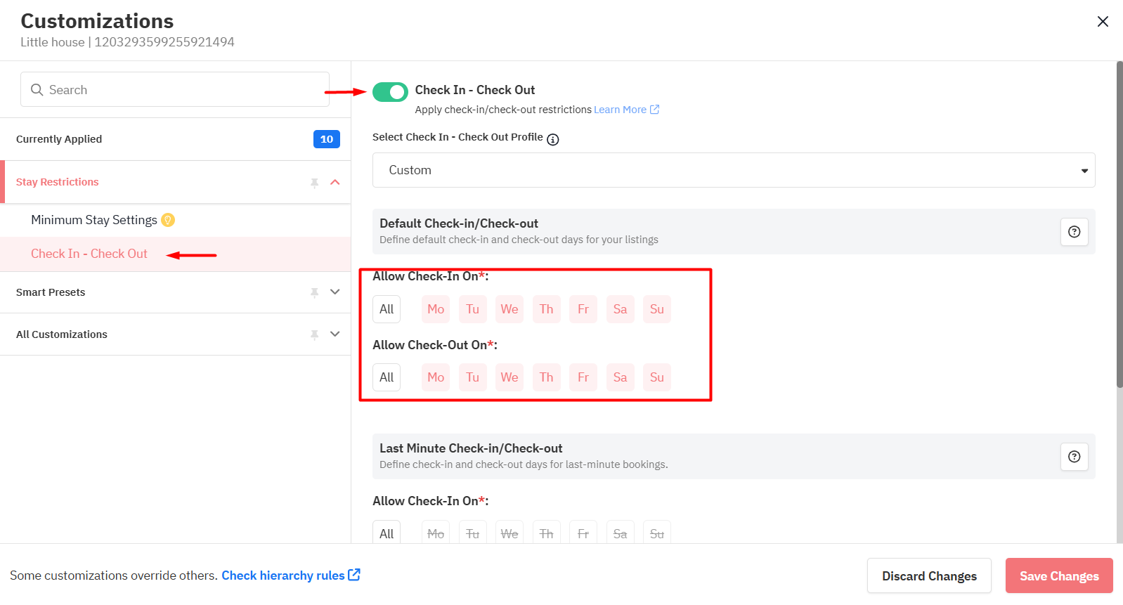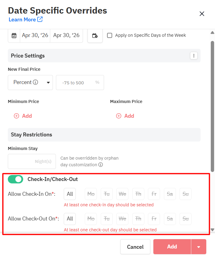 Go to theStay Restrictions section, select and enable the toggle for Check In/Check Out.
