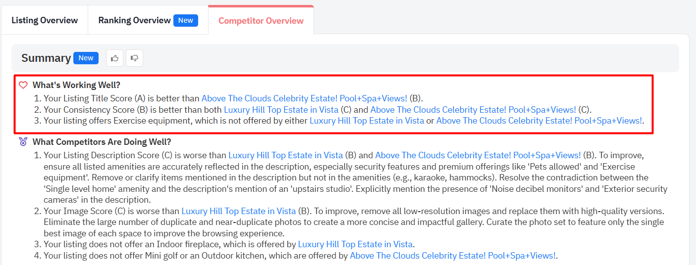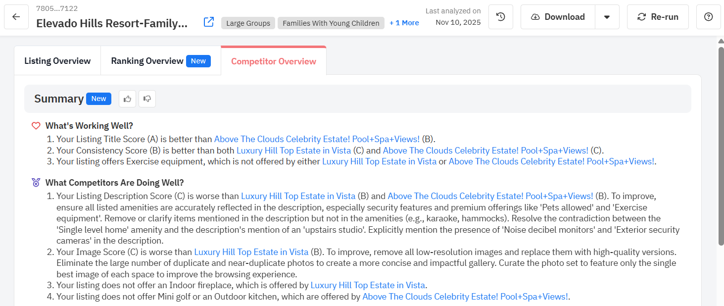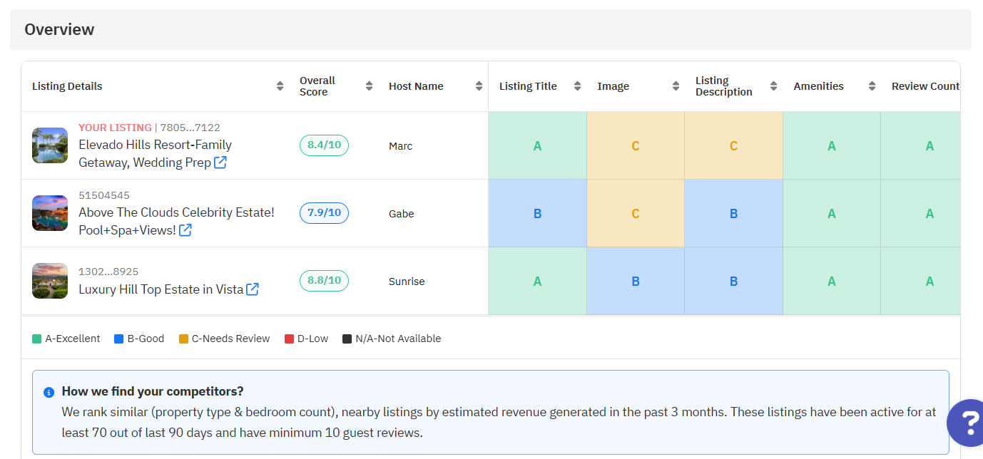 The Competition Overview Tab benchmarks your Airbnb listing against nearby competitor listings with similar attributes — such as location, property type, and size. It helps you understand how your listing stacks up in quality, content, and amenities, and what specific improvements can help you outperform your competitors in visibility and bookings.