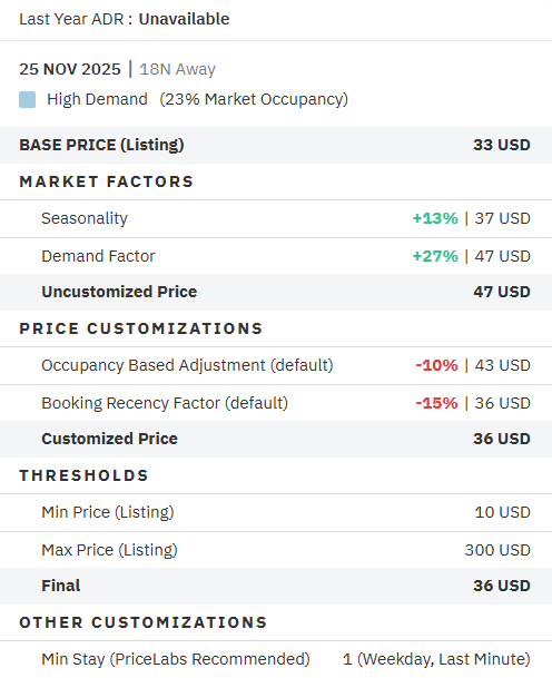 - Demand Factor: The algorithm picks up the demand for the listing by incorporating day-of-week trends, events, and holidays into the demand forecasting process. The algorithm also picks up the booking trends in the market to forecast a high/low demand.