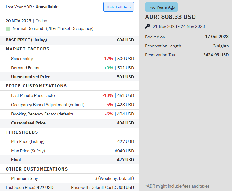 See Full Info to view the booking last year and two years ago. Please note that Last Year ADR is based on the day of week last year, not the exact date.