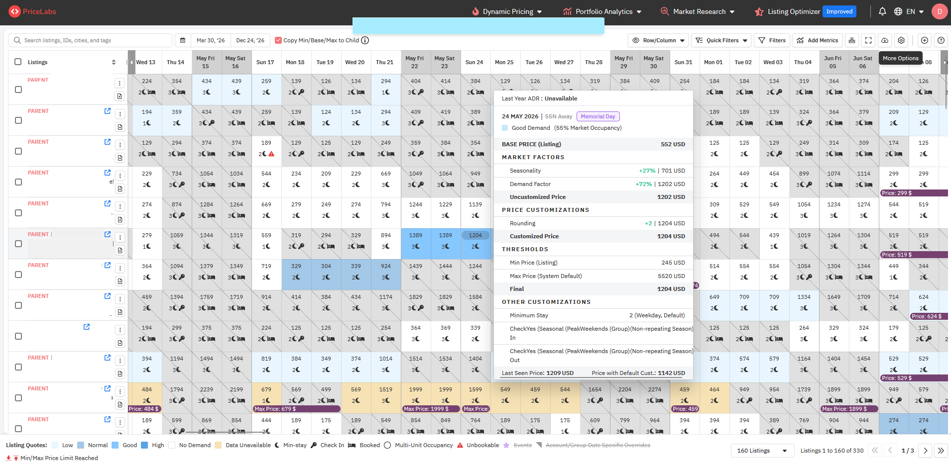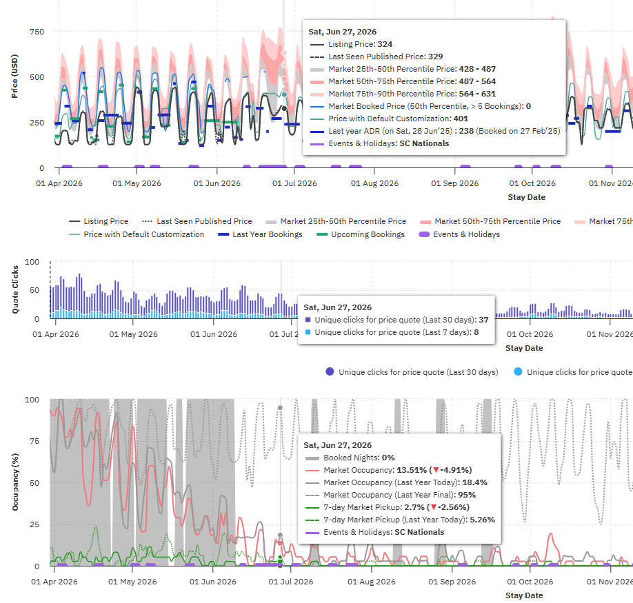 Your quote data will appear in the Listing Neighborhood Data allowing you to see how much booking interest each property is getting for each date alongside your current rates and your hyper local market occupancy and pricing trends.