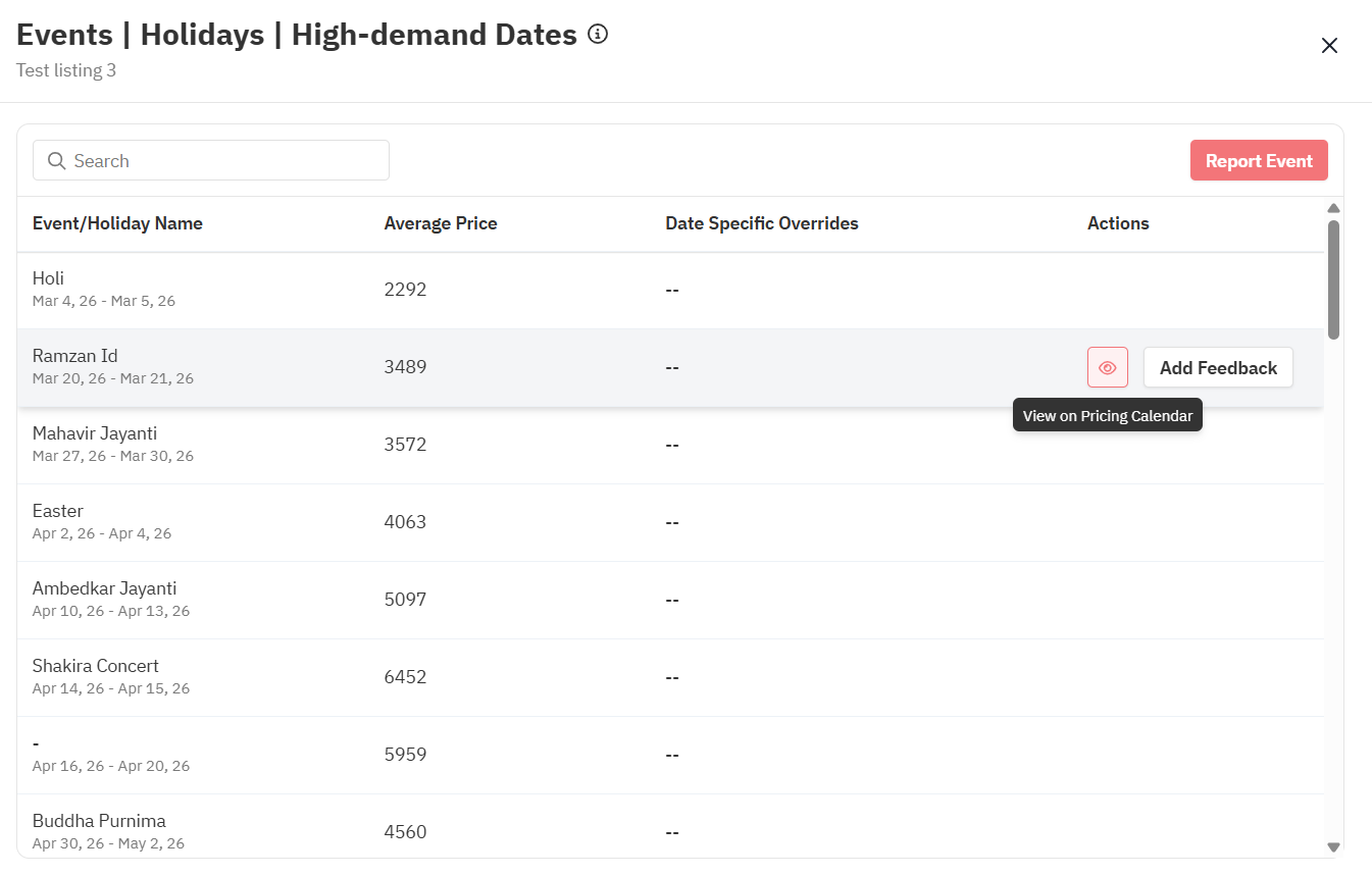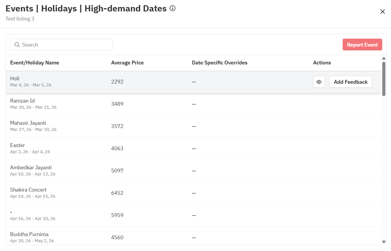 The Events/Holidays feature allows you to stay informed about significant occasions in your hyperlocal market, providing insights into upcoming events, holidays, and high-demand dates. This also includes the average prices set for each of these dates.