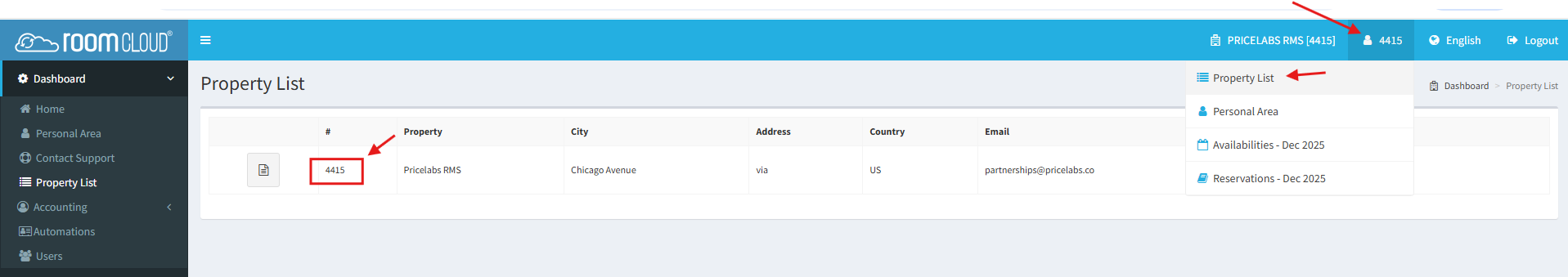 - Click on your profile=>Property List and copy the Property code. This will be required for importing the room types of the property in PriceLabs. If you have multiple properties, then each property code will have to be noted as you can import one property at a time.