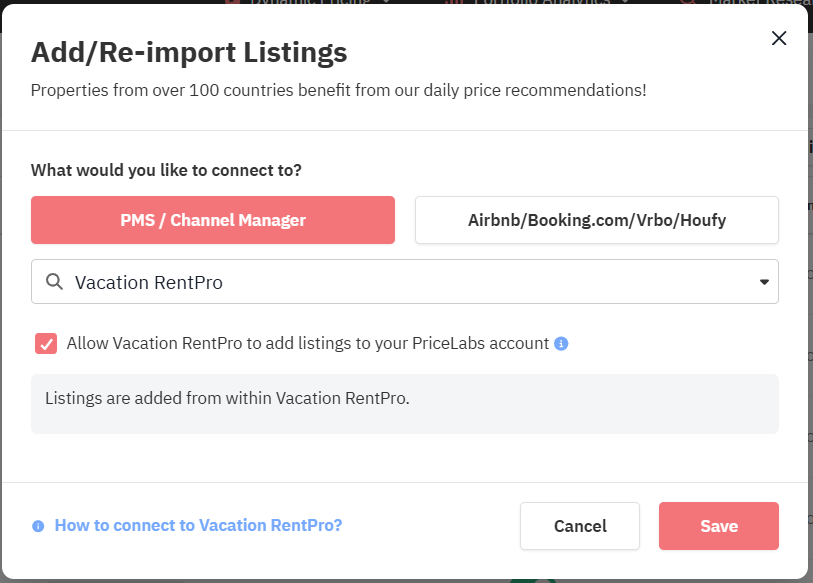 - Tick the checkbox to "Allow Vacation RentPro to add listing to your PriceLabs account."
