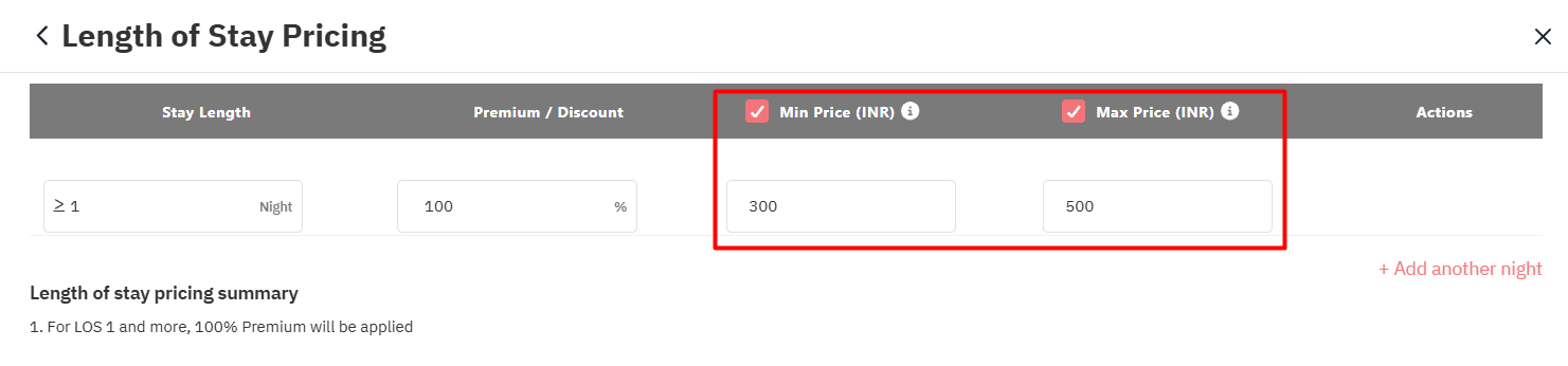 The Minimum Price is the lowest price you set for the specific length of stay and the Maximum Price is the highest price you set for the specific length of stay. While it is not always necessary to set this as you already have minimum or maximum prices set for the daily prices, if you also want to set a minimum or maximum price depending on how long a guest books your listing, you can enable this feature by ticking the box on the Length of Stay Pricing table.