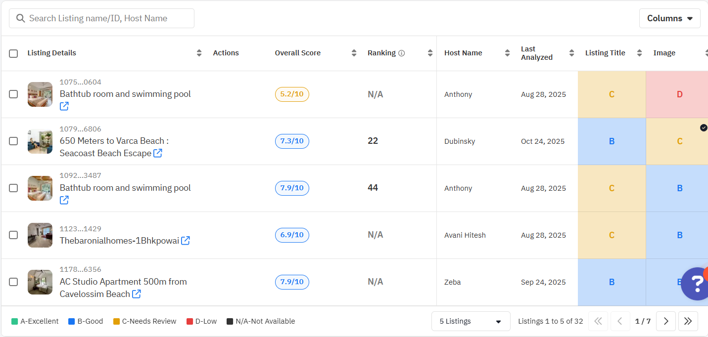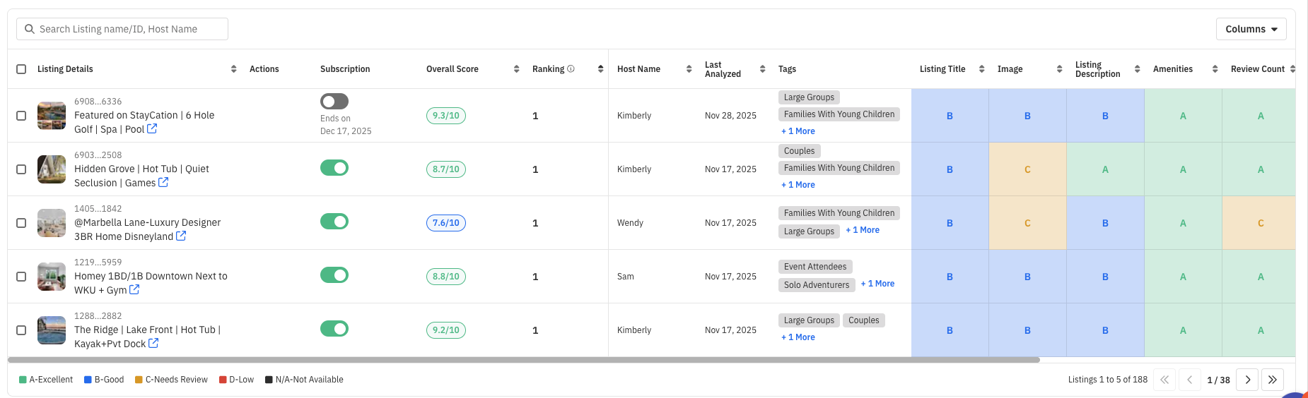 The Listing Overview Table provides a detailed view of each analyzed listing along with its current grades and key actions.