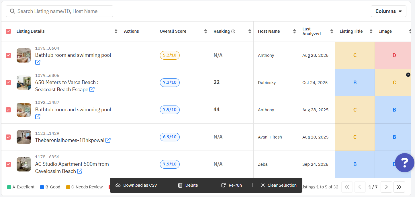 - Download CSV – Export detailed insights for selected listings, including competitor comparisons, quality scores, and recommendations.