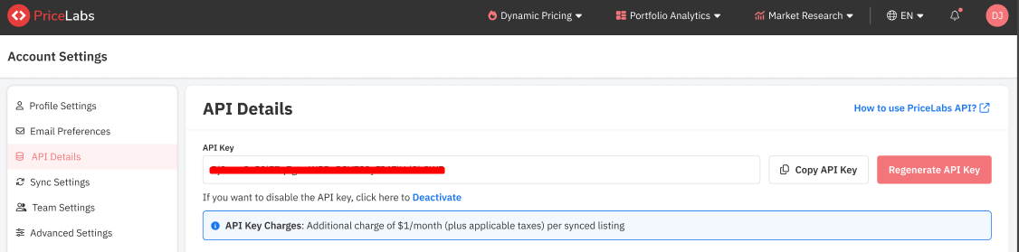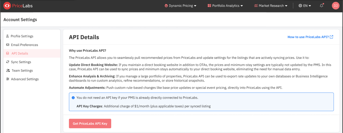 Go to the Account Settings page, click "API Details," click "Get PriceLabs API Key".