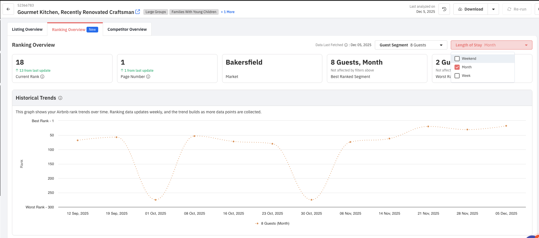 Rank data is refreshed Weekly, allowing hosts to track visibility trends and correlate changes with updates to their listing content, pricing, or amenities.