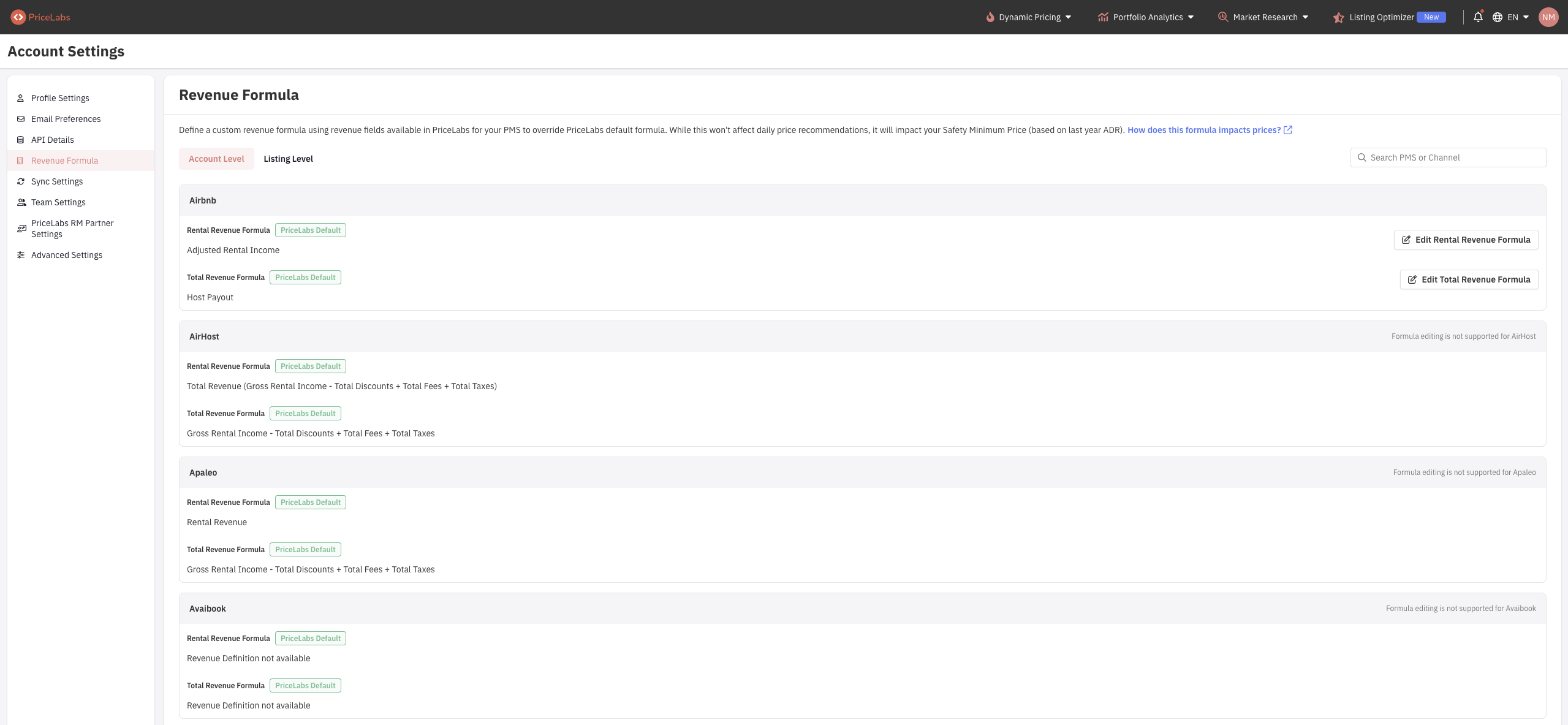 Transparency for Other PMSs: For most of the other PMSs where custom formulas are not yet supported, you will still be able to view the default revenue definition that PriceLabs is currently using for your account. This provides necessary transparency even if the definition is not editable.