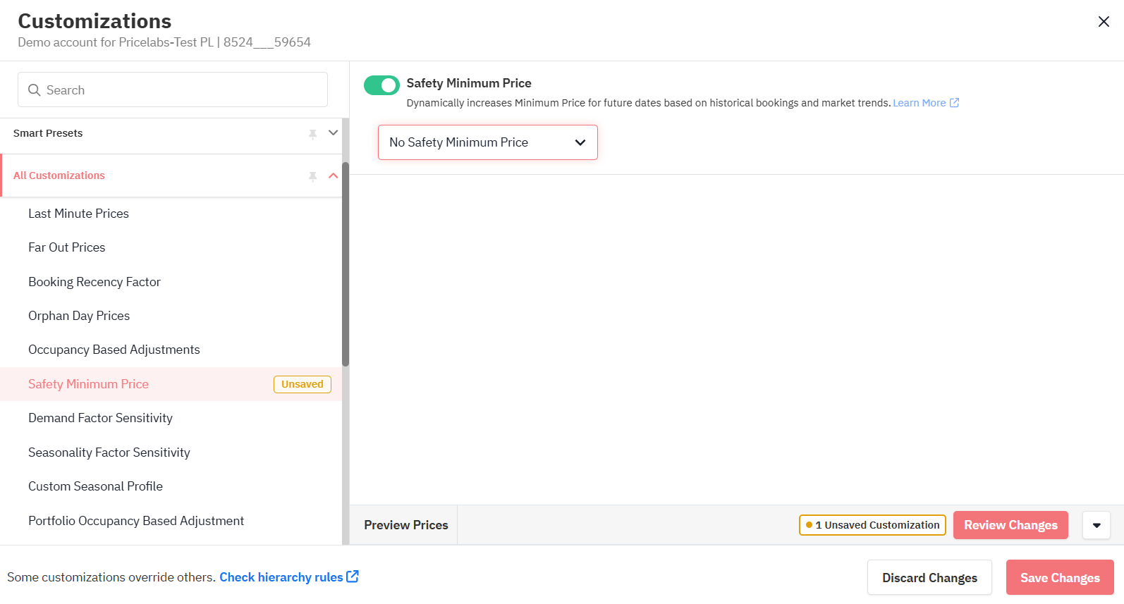 The Safety Minimum Price is only available for Property Management Systems (PMS) or Channel Managers which provide PriceLabs with Nightly Revenue details for every booking/reservation. If your PMS does not support providing us with Nightly Revenue details, then you won't be see the option of Safety Minimum Price.