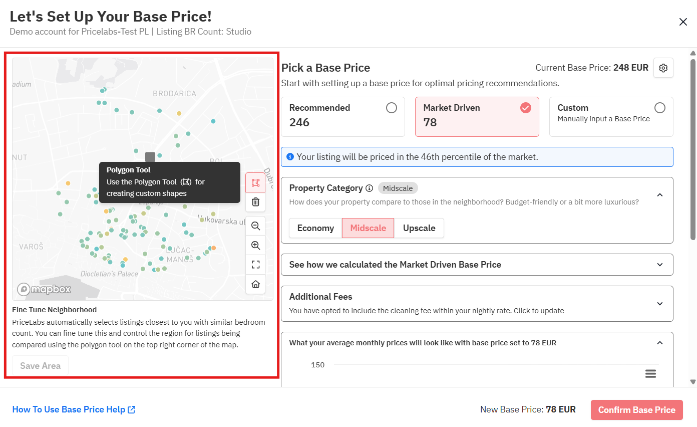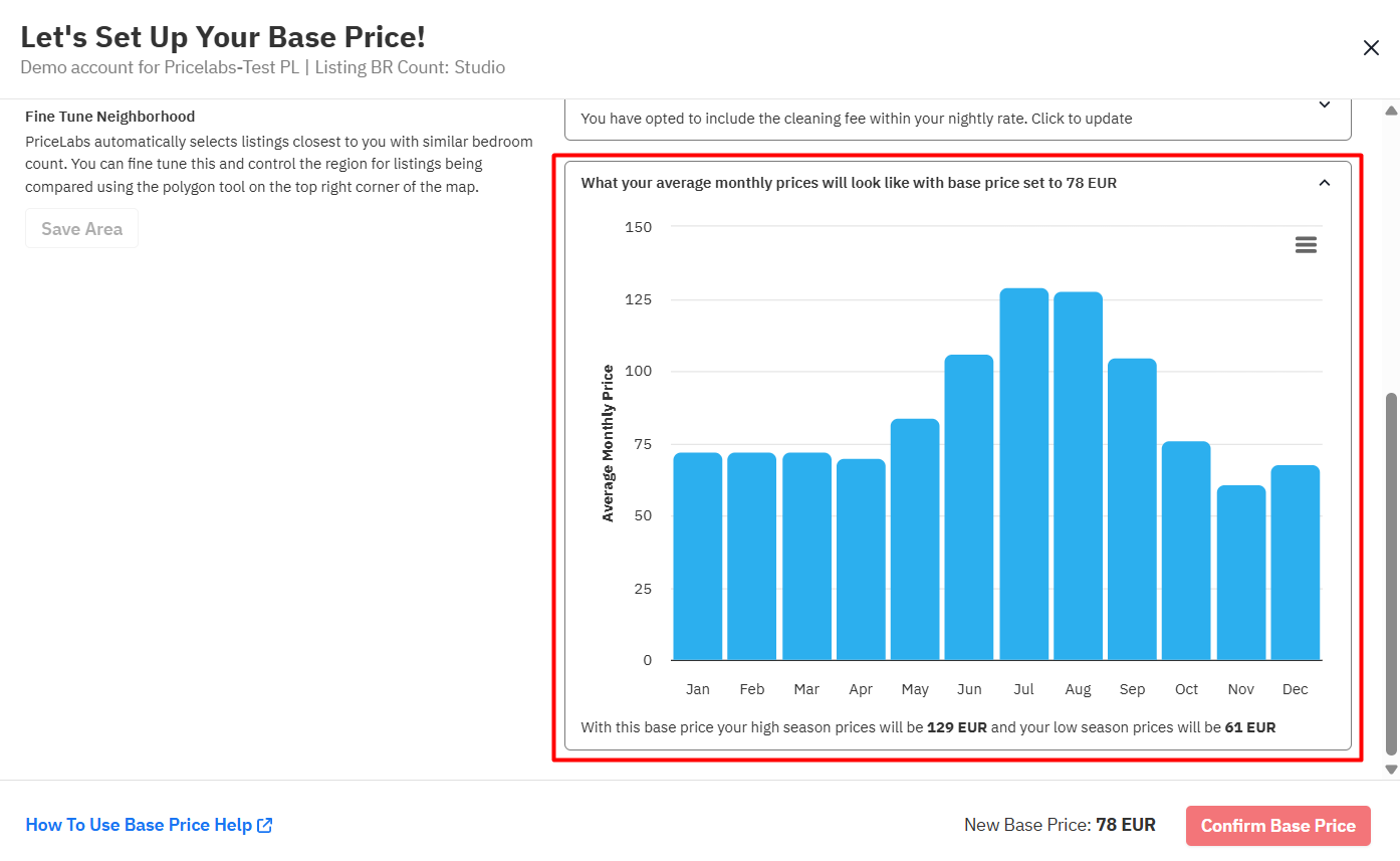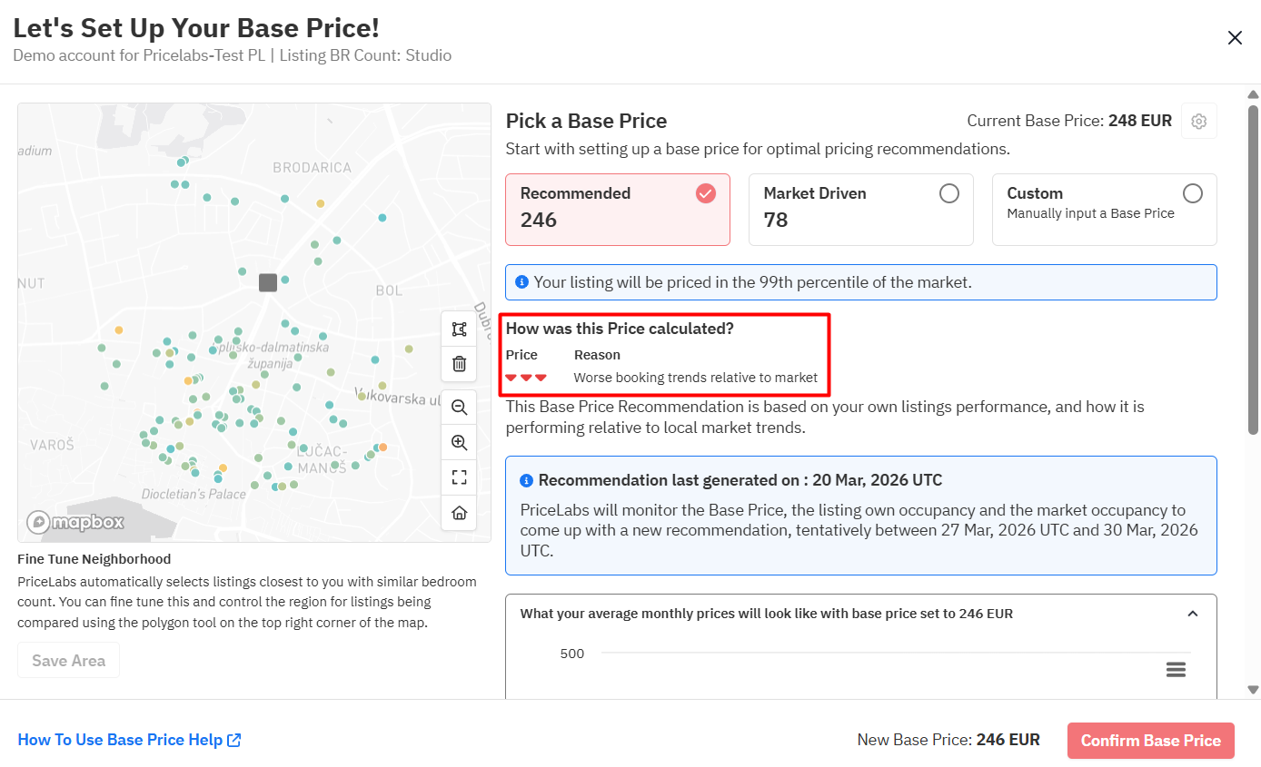 - The algorithm learns from it — After 7 days, PriceLabs recommends a base price based on your listing’s performance. For example, if your place is booking faster than the market, it will suggest increasing your base price. This can also take up to 14-21 days if your listing is new.