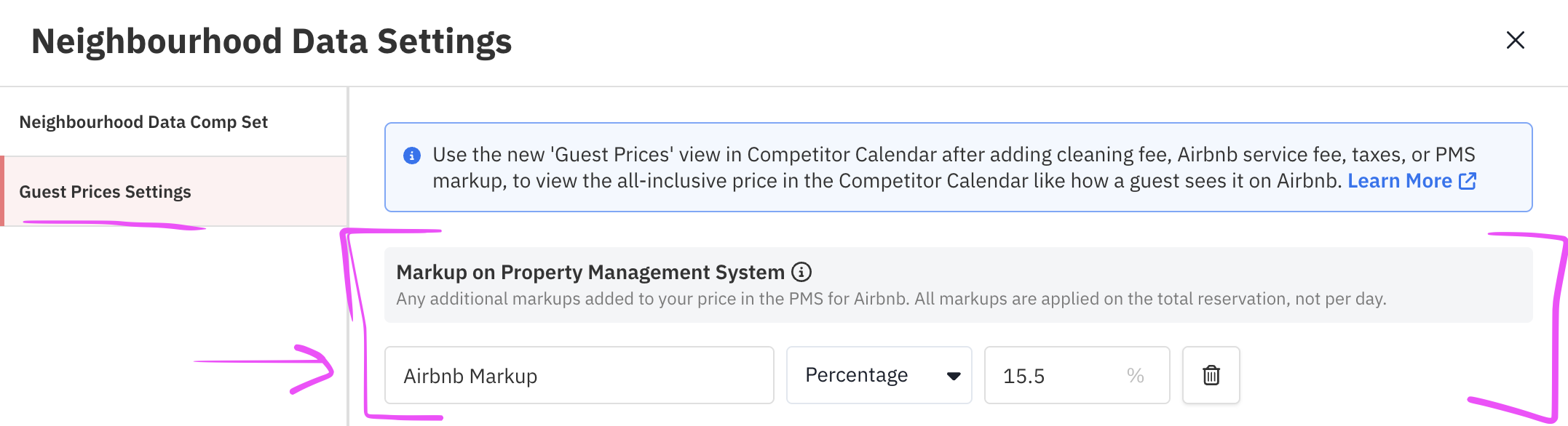 NOTE: If you add a Markup on PMS / Channel Manager to account for the OTA cost (i.e. airbnb commission), then we apply an adjustment factor for the markup before final base price recommendation. You can let us know about the PMS Markup in the Neighborhood Data Settings
