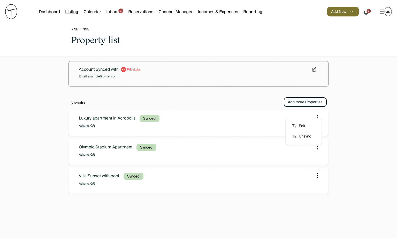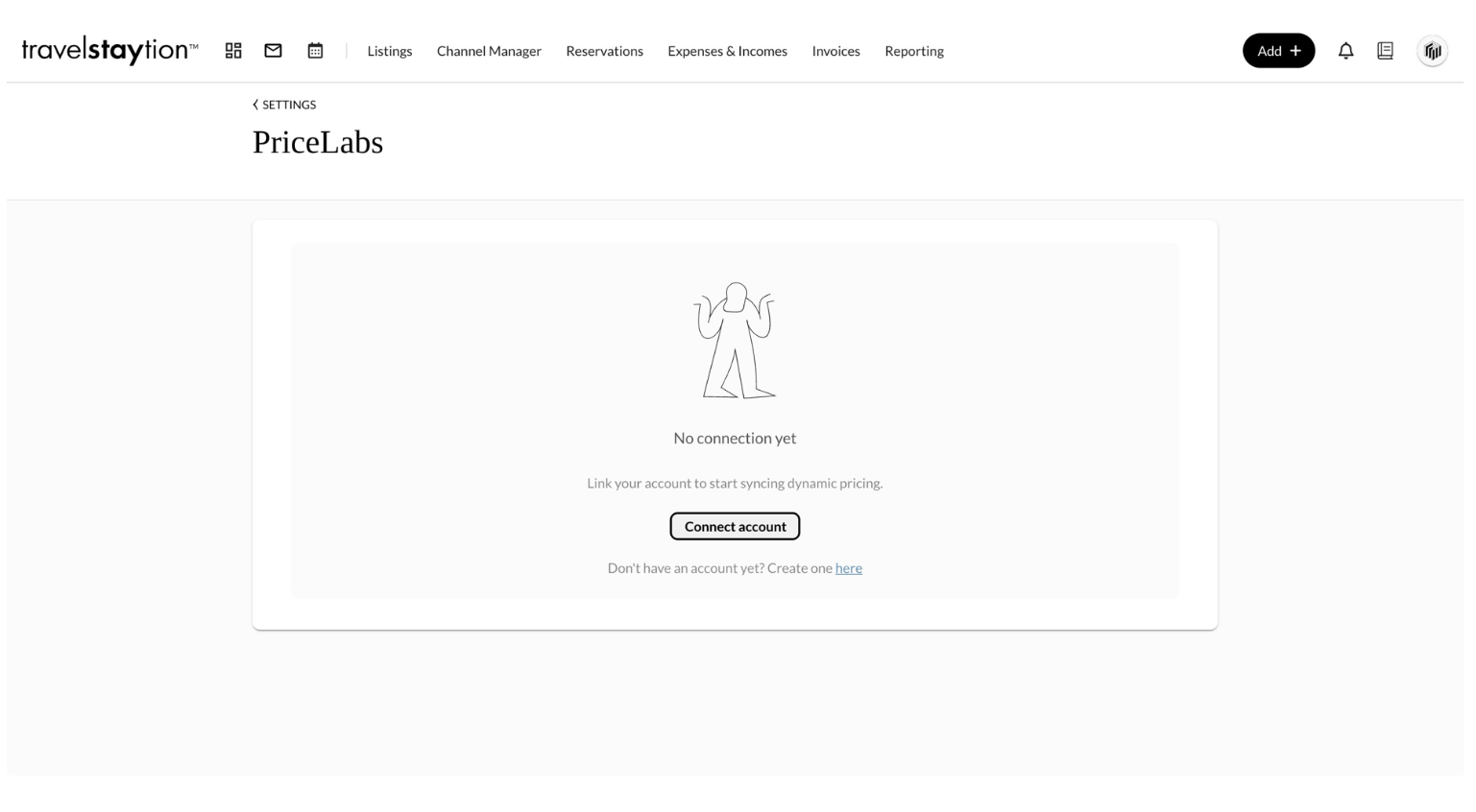 Inicia sesión en tu cuenta de TravelStaytion y, en la sección Configuración, sincroniza tu cuenta de PriceLabs (capturas de pantalla a continuación).