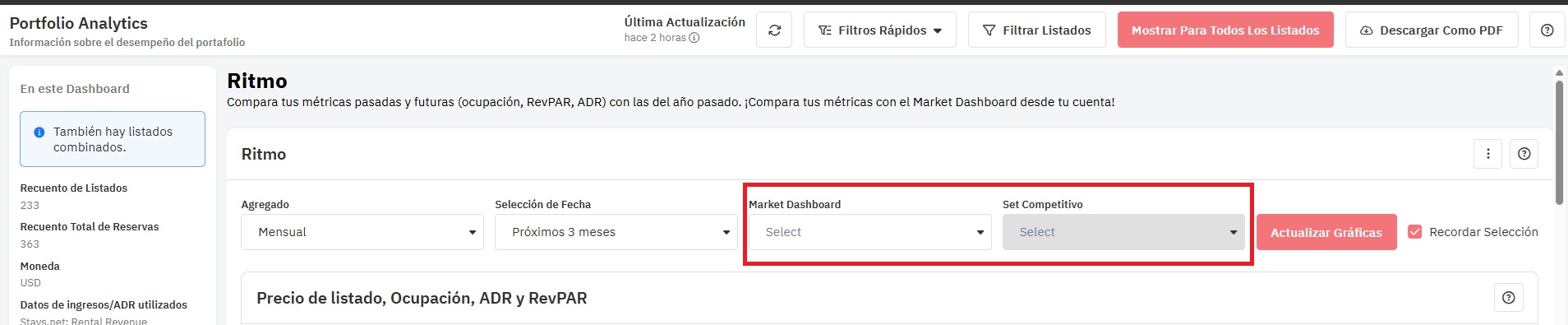 Te permite comparar los gráficos de precios y ocupación futuros de un listado con un set competitivo de