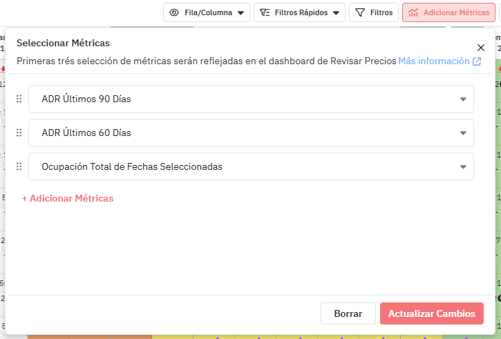 Agregar métricas: Te permite agregar, reemplazar o eliminar columnas de métricas
