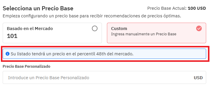 muestra en qué percentil del mercado seleccionado estará el precio base recién