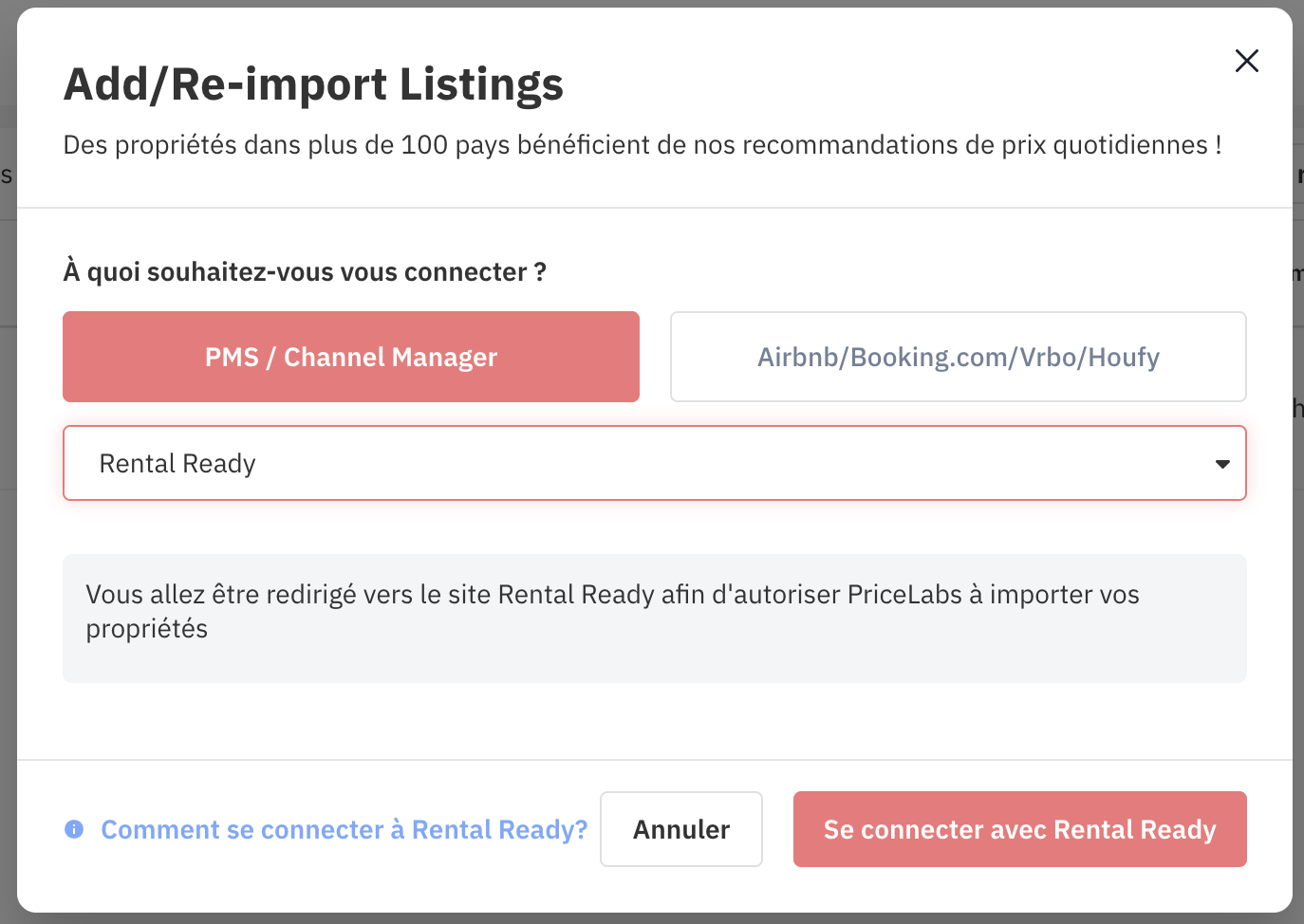 - Si vous n'êtes pas encore connecté, connectez-vous à RentalReady et autorisez PriceLabs à accéder à vos annonces.