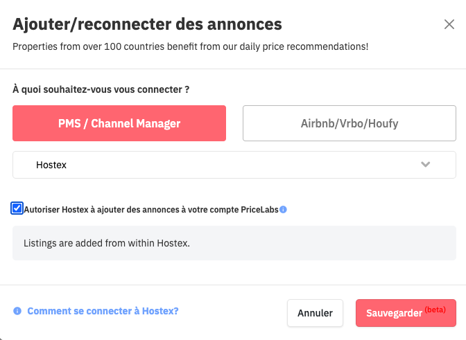 - Dans la fenêtre contextuelle, sélectionnez « Hostex » et cochez « Autoriser Hostex à ajouter des annonces à votre compte PriceLabs ».