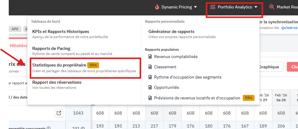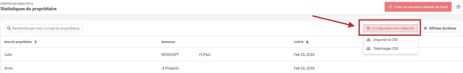l’ensemble des tableaux de bord de propriétaires existants. Accédez à la page Statistiques du propriétaire à partir du menu déroulant Portfolio Analytics de