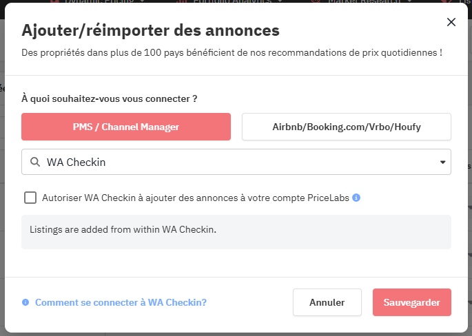 - Cochez la case "Autoriser WA Checkin à ajouter des annonces à votre compte PriceLabs". Cliquez