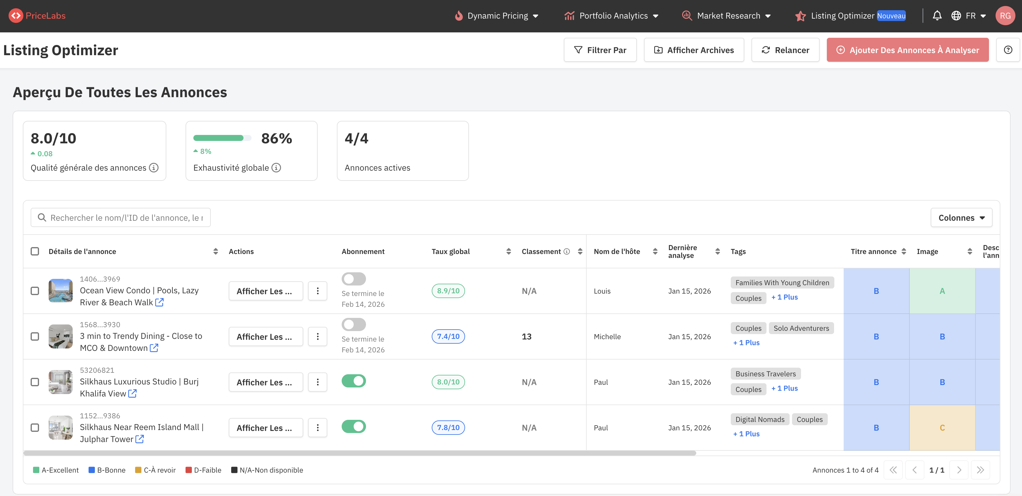 Evaluation instantanée de la qualité : Chaque annonce reçoit un score global et une note (A–D) qui reflète son exhaustivité et son respect des bonnes pratiques.Recommandations pilotées par l'IA : Obtenez des suggestions précises pour améliorer le titre, la description ou la présentation des photos de votre annonce.Analyses au niveau du portefeuille : Visualisez des indicateurs clés agrégés comme le % d'exhaustivité des annonces et identifiez les annonces sous-performantes en un coup d'œil.Benchmark concurrentiel : Comparez vos annonces aux annonces les plus performantes à proximité pour voir où vous vous situez.Visibilité du classement : Suivez l'évolution de votre classement Airbnb au fil du temps pour comprendre comment les améliorations de qualité affectent votre visibilité.Où trouver le Listing Optimizer