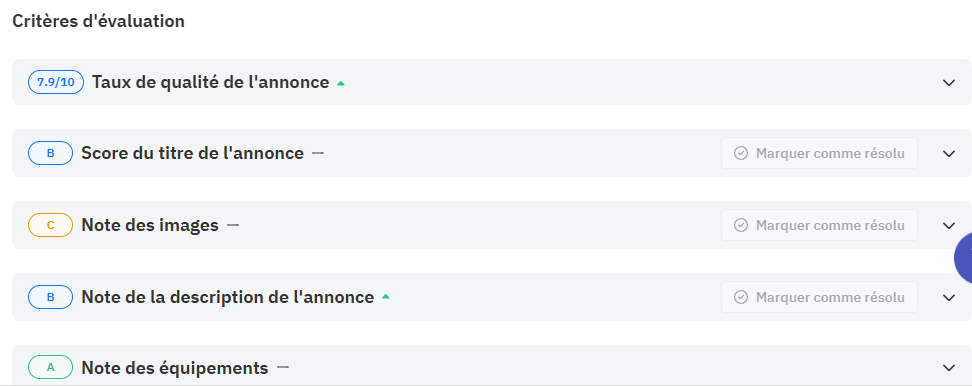 Chaque évaluation d'annonce comporte ainsi les sections suivantes :