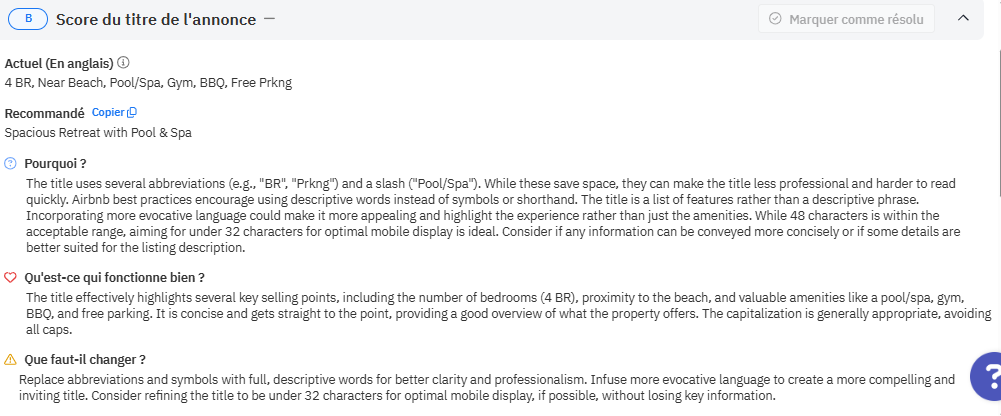Cette page est divisée en plusieurs sections d'analyses claires et exploitables, y compris les critères d'évaluation, l'analyse des images, et l'optimisation du positionnement. Ces analyses sont assorties de commentaires générés par l'IA qui se basent sur les facteurs d'accroissement de la visibilité et de croissance des revenus observés sur Airbnb à travers le monde.