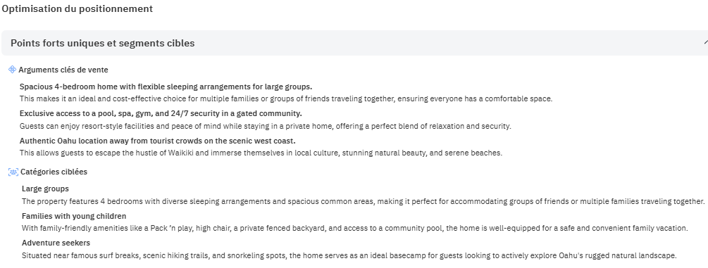 - Tenez compte des conseils d'optimisation du positionnement pour que le message de votre annonce corresponde à votre type de voyageur idéal (par exemple, "Idéal pour les couples" ou "Parfait pour de longs séjours").