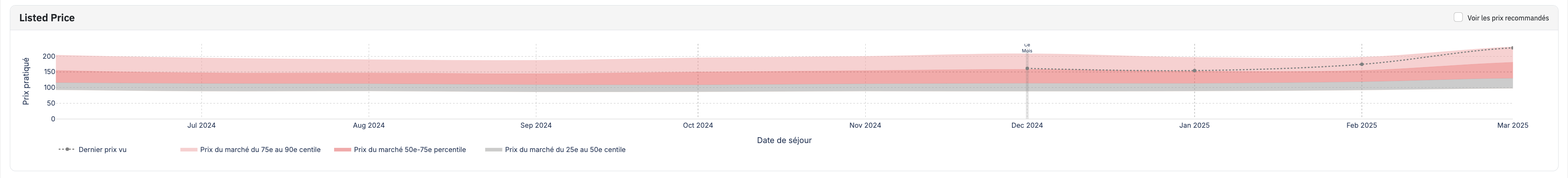 Interprétation : La comparaison du Prix publié avec les données historiques ou les tendances du marché permet d'évaluer la compétitivité. Des écarts importants par rapport à des logements similaires ou à des prix antérieurs peuvent signaler la nécessité de procéder à des ajustements. Les rapports de Pacing permettent aux utilisateurs de suivre cette mesure par rapport aux références du marché, fournissant un contexte pour les décisions de tarification.