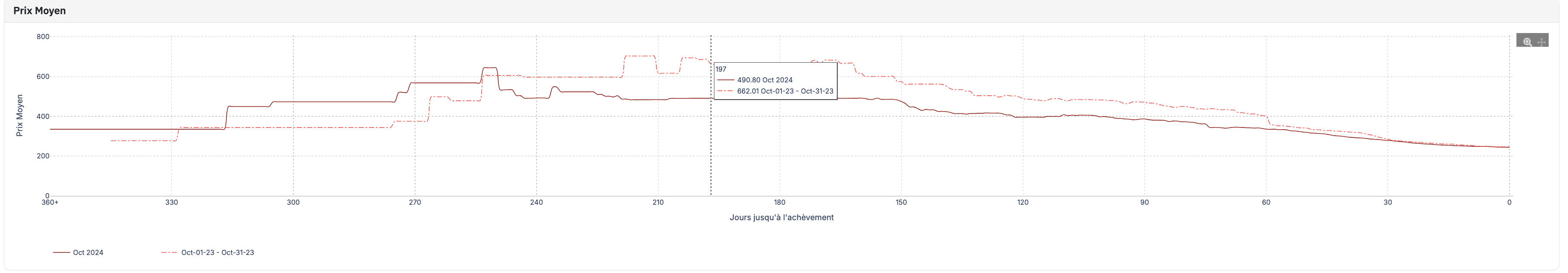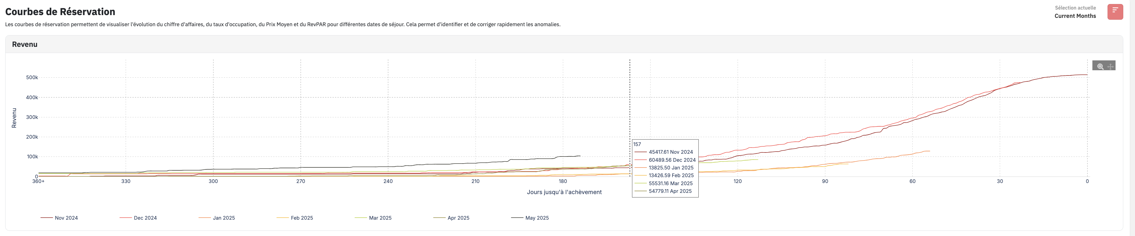 Courbes de réservation : Ces graphiques montrent l'évolution de ces paramètres dans le temps pour les mois à venir, ce qui donne une idée des performances futures. Une baisse du taux d'occupation à l'avenir, par exemple, pourrait inciter à un avis sur les prix ou les efforts de marketing.