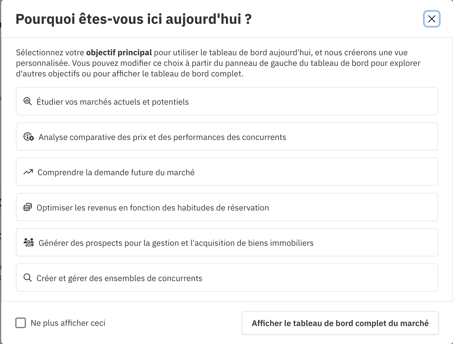 Market Dashboard comprend une expérience guidée basée sur des cas d’usage, conçue pour vous aider à trouver des informations et à prendre des mesures rapidement. Au lieu de parcourir tout un tableau de bord contenant de nombreux graphiques, vous pouvez commencer par sélectionner un objectif principal parmi une liste prédéfinie de cas d’usage courants.