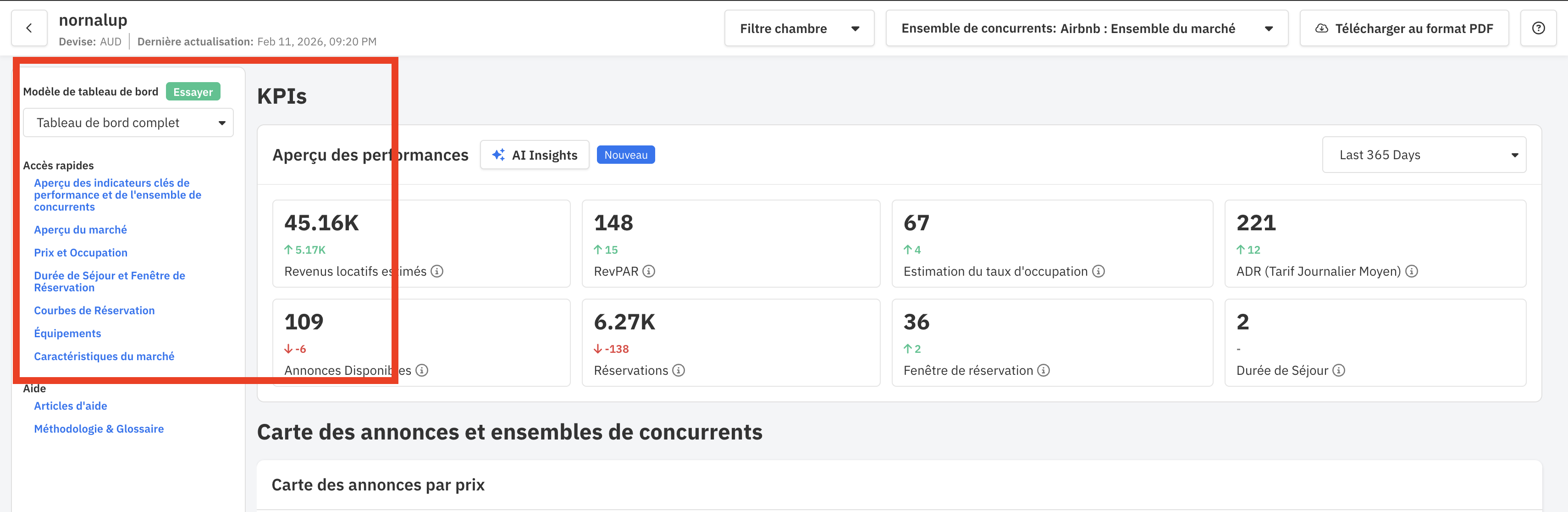 - Sections : Carte des annonces par prix, Annonces et ensembles de concurrents
