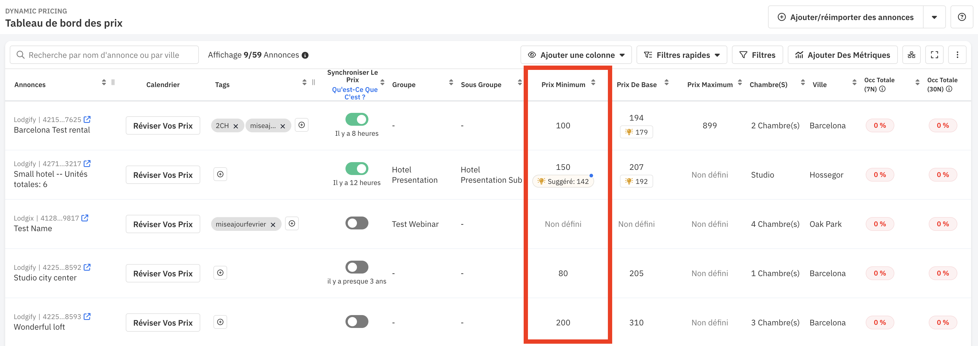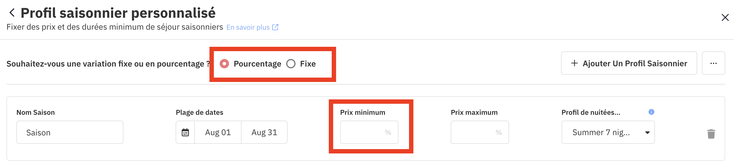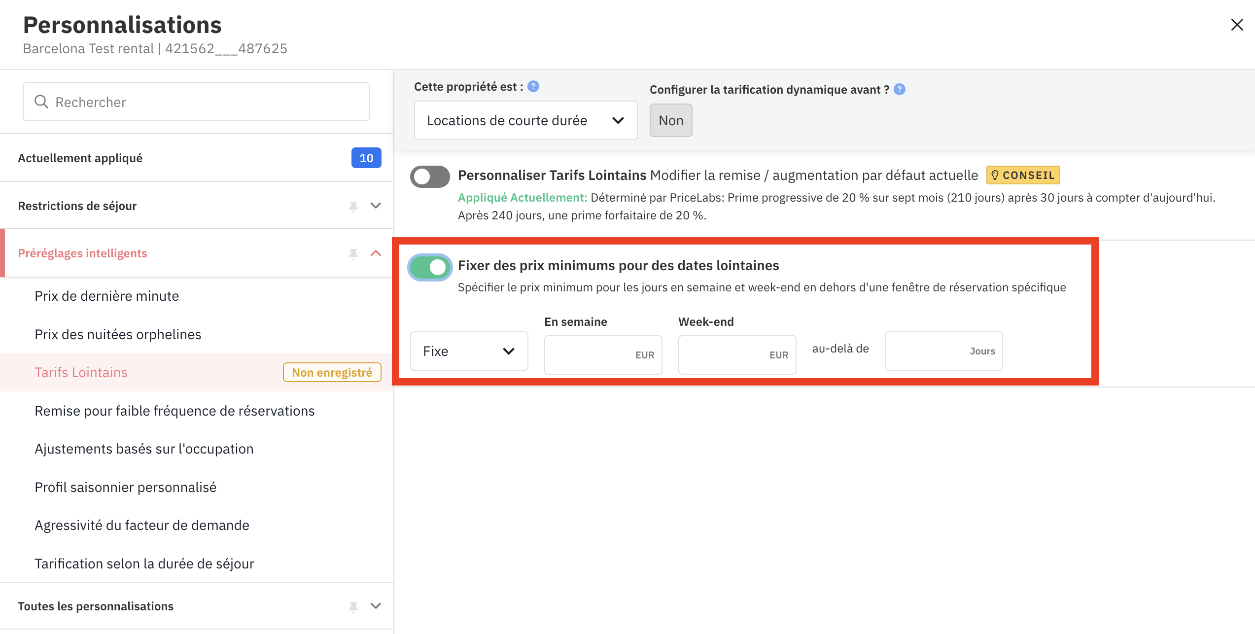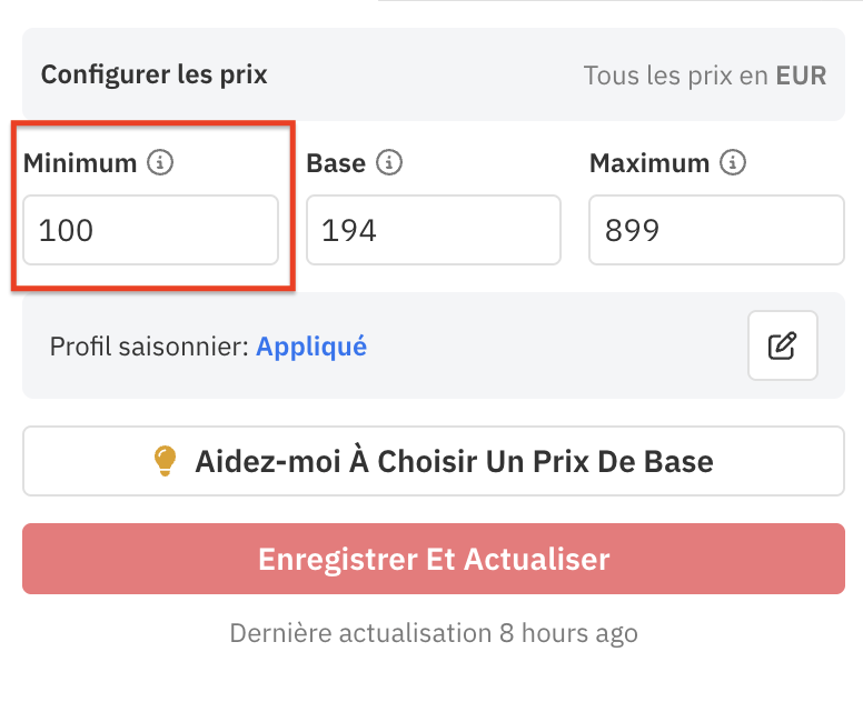 Nous vous recommandons vivement de définir un prix minimum afin d’éviter que vos tarifs ne descendent trop bas pendant les basses saisons ou lors des remises de dernière minute.