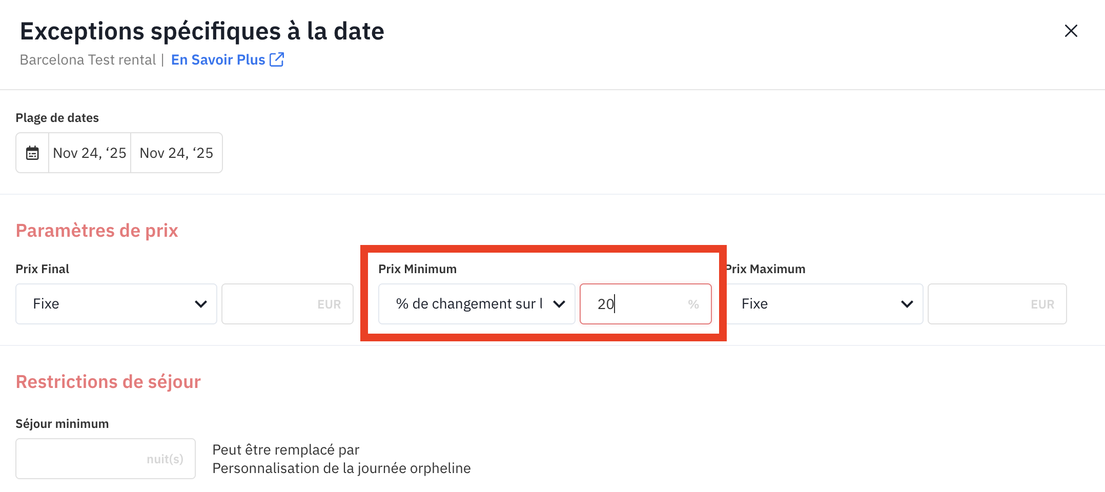 Si le Prix minimum est réglé sur « % de modification du prix minimum », ce pourcentage est appliqué après l’ensemble des personnalisations du prix minimum (à l’exception des dérogations par date). Cela inclut les prix minimums anticipés et saisonniers.