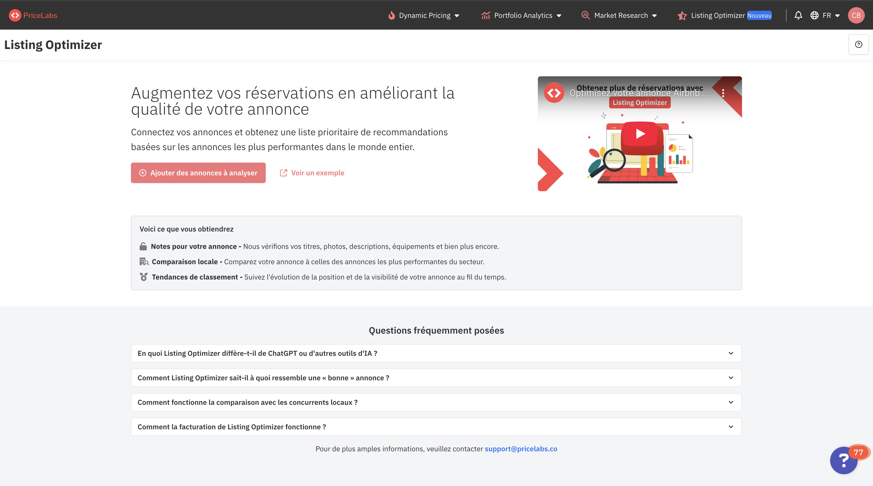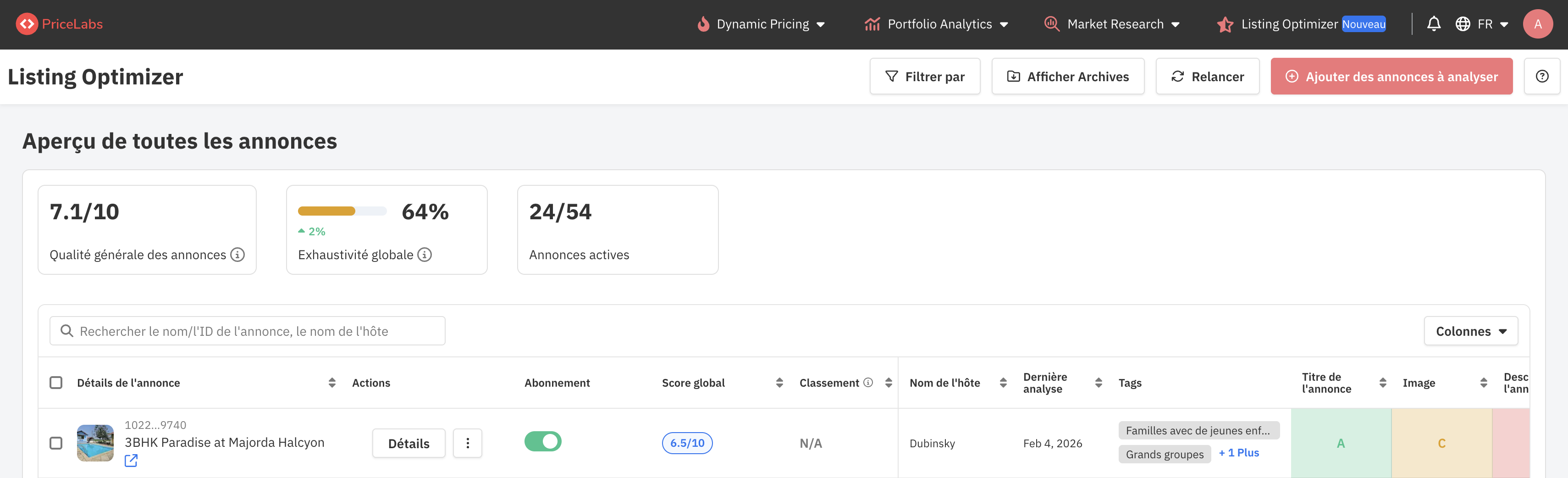 Listing Optimizer est un outil puissant de PriceLabs qui aide les hôtes Airbnb et gestionnaires de logements à évaluer et améliorer la qualité de leurs annonces. Il analyse le contenu des annonces, les photos, les facteurs d’expérience voyageur et les équipements, puis attribue un score qualité (de A à D). L’outil fournit ensuite des recommandations optimisées par l’IA pour vous aider à augmenter la visibilité de votre logement, les taux de conversion et les réservations. Pour en savoir plus sur ce produit, consultez cet article du Centre d’aide.