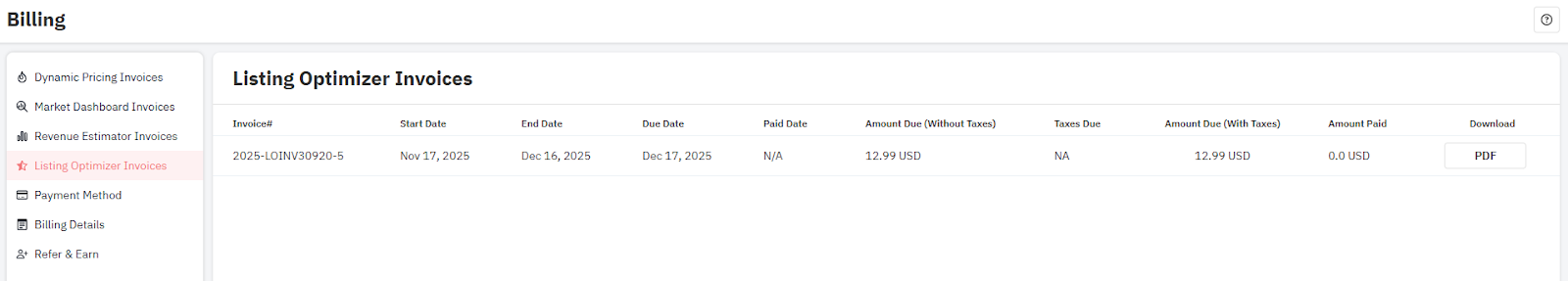 Fin du cycle de facturation : La taxe de vente applicable à votre facture Listing Optimizer est calculée à la fin de votre cycle de facturation. Votre facture est mise à jour pour refléter le montant de la taxe.