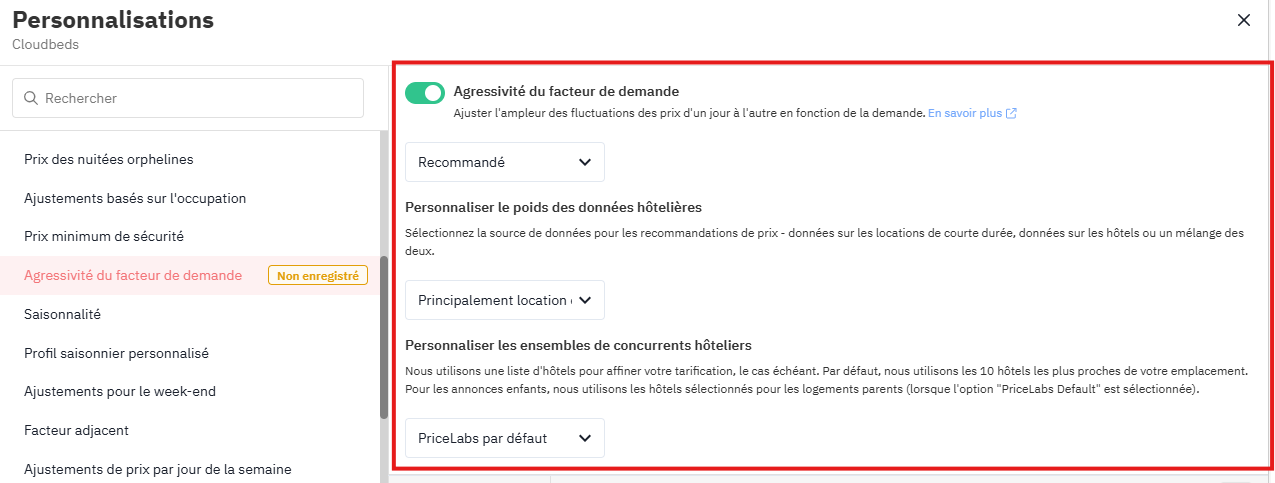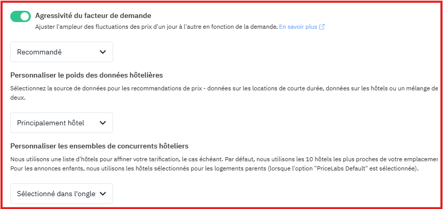 Permet de vérifier si les recommandations de prix sont influencées par les données sur les hôtels, les données sur les locations courte durée, ou une combinaison des deux. Activez ce paramètre et sélectionnez « Principalement hôtel » pour que les prix soient principalement déterminés par la demande du marché hôtelier, avec une faible part influencée par les tendances des locations de vacances.