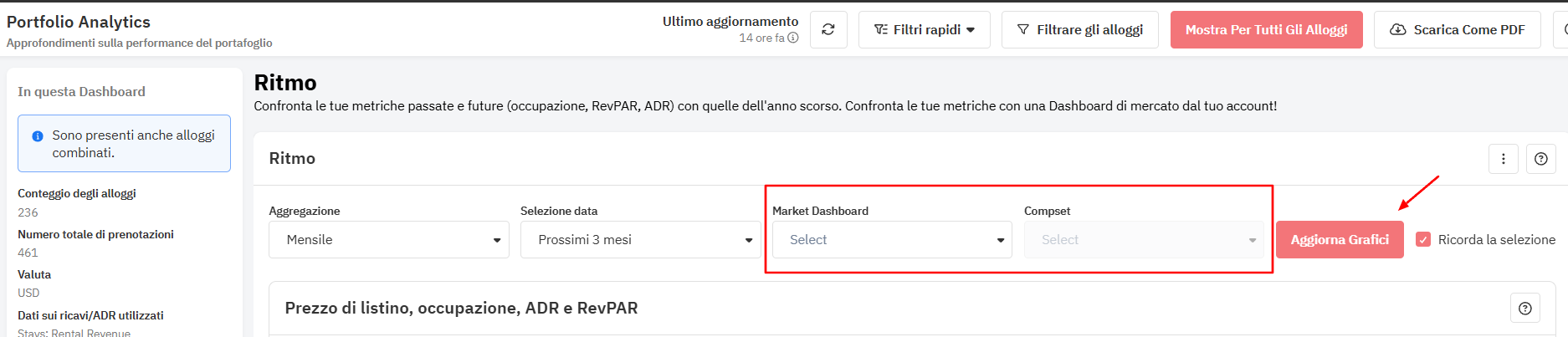- Proprio sopra il primo grafico, è possibile selezionare la Market Dashboard e il compset nel rispettivo menu a discesa.