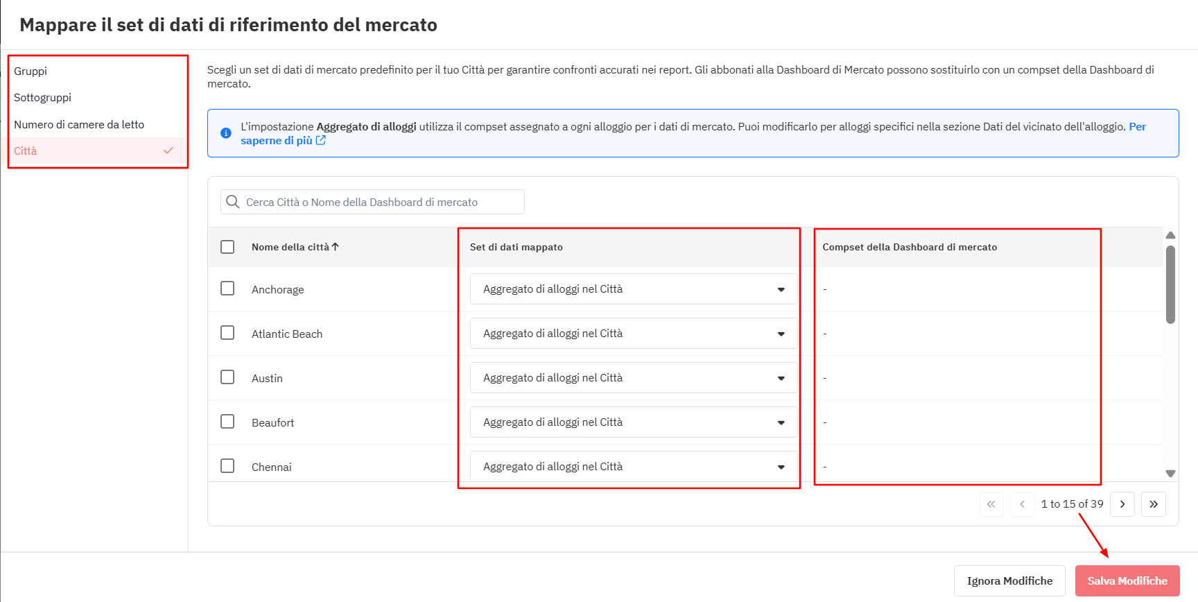 Dashboard di mercato - Mappa degli alloggi e compset