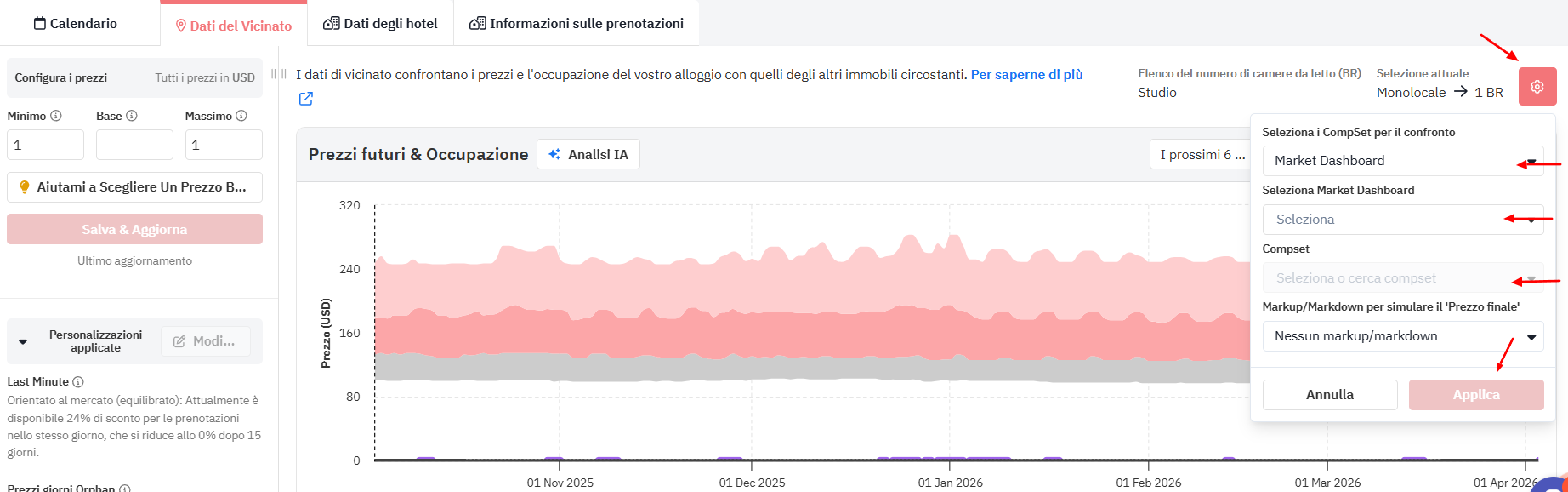 - Consente di confrontare grafici di Prezzi futuri e Occupazione di un alloggio, confrontati con un compset di dashboard di mercato, invece che con gli Alloggi nelle vicinanze, in modo da poter individuare le differenze di prezzo e della domanda prima di ricevere prenotazioni. In questo modo, puoi vedere dove si trovano i prezzi del tuo alloggio e il compset rispetto a un alloggio che è stato scelto specificamente da te, non solo quelli con categorie di camere da letto simili nel vicinato.
