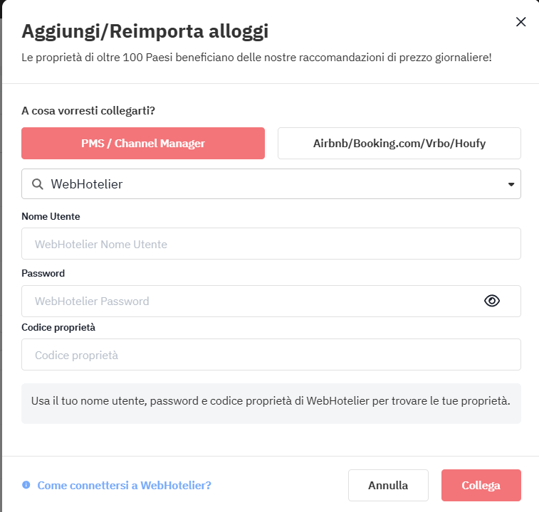 Passaggio 2: Collegare WebHotelier a PriceLabs