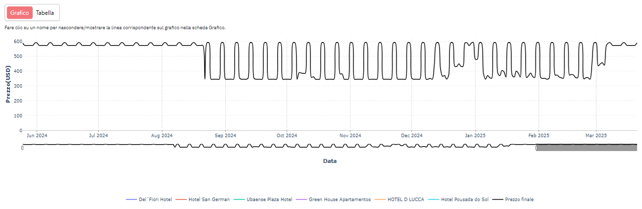 Visualizzazione grafico Consente di confrontare la posizione delle tue tariffe tra gli hotel selezionati. Facendo clic su un nome nella legenda, è possibile nascondere/mostrare la linea dell'hotel corrispondente nel grafico. La linea nera rappresenta il “Prezzo finale”, ovvero prezzi consigliati da PriceLabs.