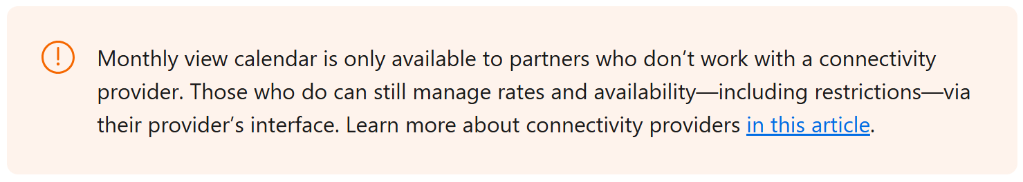 Booking.comのリスティングがRMSやPMSプラットフォームを含むAPIパートナーと連携している場合、Booking.comの月間カレンダー表示は利用できません。ユーザーはカレンダーのリスト表示と年間表示のみにアクセス可能となります。これはBooking.com側の仕様によるものであり、API経由で連携されているすべてのリスティングに共通して適用されます。詳しくはこちらをご覧ください。