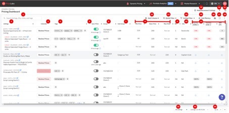 価格設定ダッシュボードは、接続されたすべてのアカウントからインポートされた物件の概要を包括的に表示します。複数の列と検索バーを備え、特定のリスティングを見つけるのが容易になるので、何十もの物件を管理する際に大変貴重なツールです。