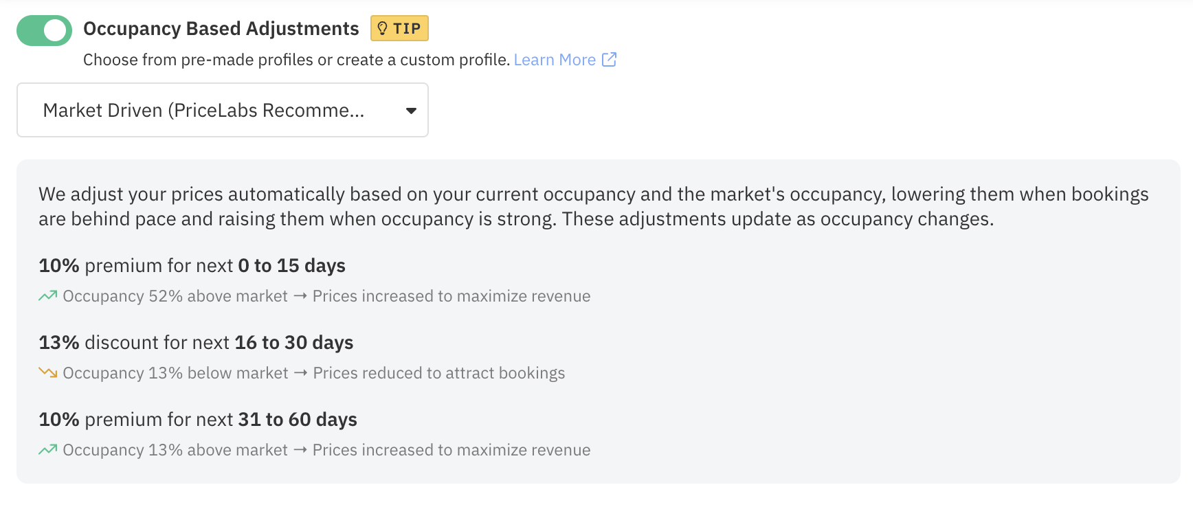 Se você costuma alterar o preço base de acordo com as tendências de ocupação, esse recurso pode ajudar a automatizar o processo. Por exemplo, se a sua propriedade estava tendo um bom desempenho, mas de repente sofreu uma queda nas reservas, o sistema pode ajustar os preços de acordo com a situação.