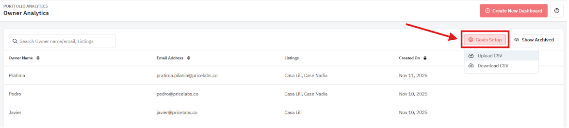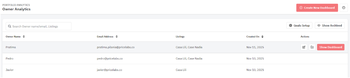 A página "Análise de Proprietários" é a sua central para acompanhar e gerenciar todos os painéis de proprietários existentes. Acesse a páginaAnálise de Proprietários do menu suspenso Portfolio Analytics no cabeçalho.