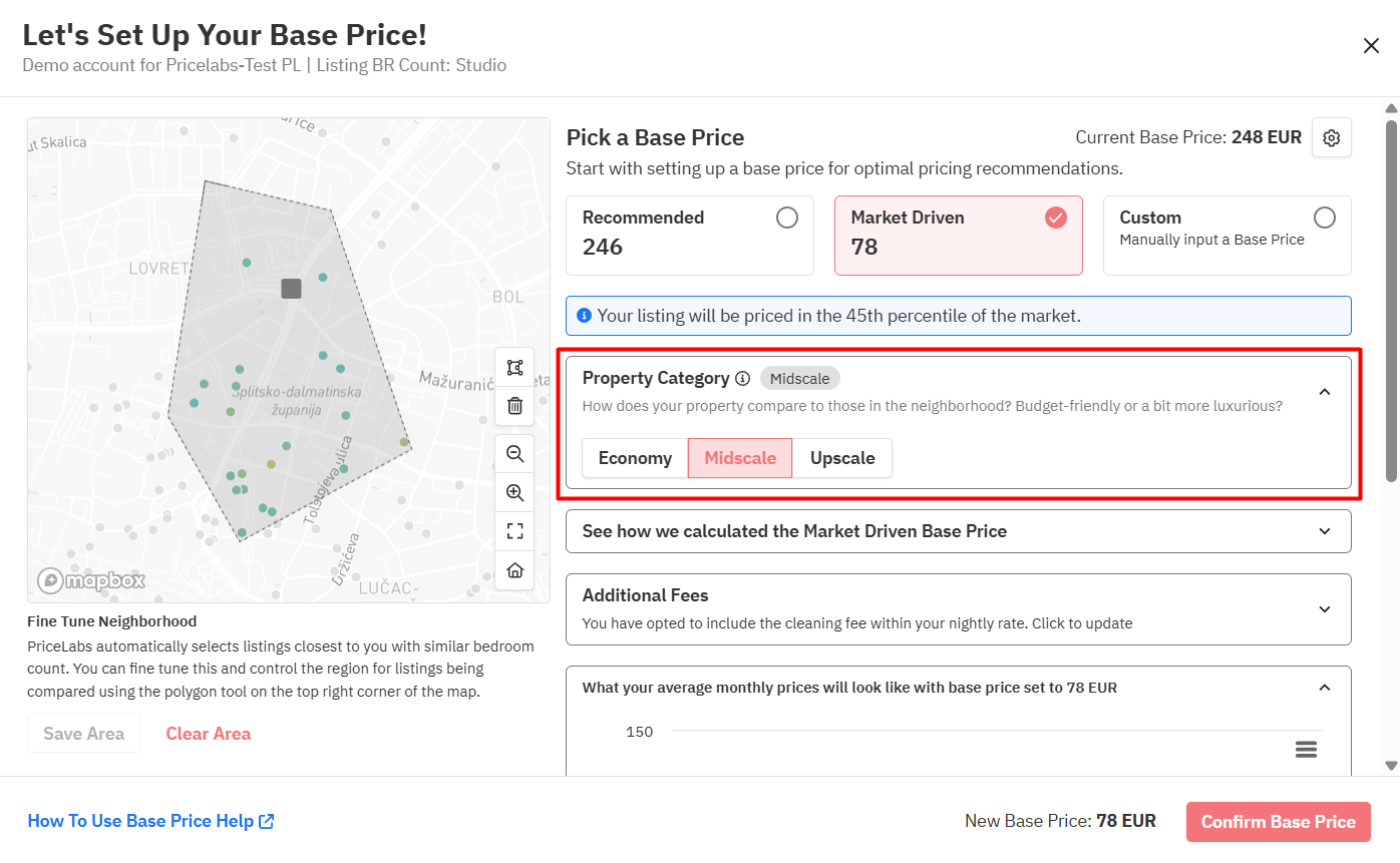 A opção "Orientado pelo mercado" é o melhor ponto de partida para a maioria dos usuários. O PriceLabs pode solicitar o ID da sua propriedade no Airbnb, a taxa de limpeza e o markup do PMS. Forneça essas informações para ter mais precisão no resultado.